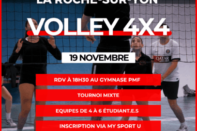 Les inscriptions pour la deuxième soirée du Challenge Sportif des étudiants de la Roche sur Yon sont ouvertes ! Formulaire d’inscription Venez affronter les autres étudiants sur le tournoi de Volley 4×4 !... Pour en savoir plus
