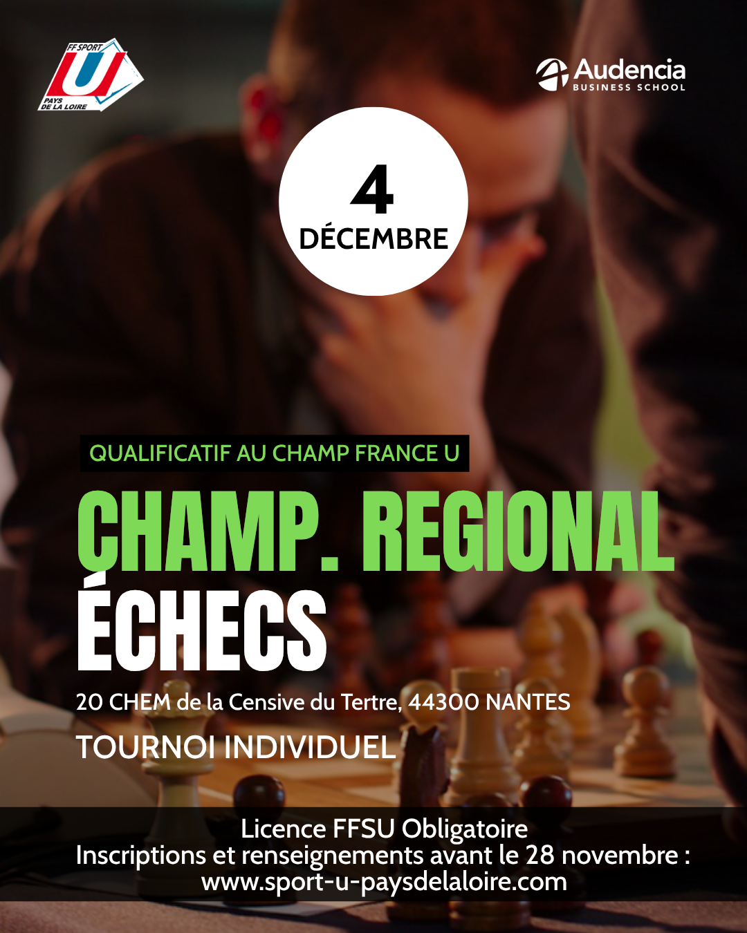 | ECHECS | CHAMPIONNAT REGIONAL qualificatif pour le CFU | 28 novembre | 4 décembre 2025 | Nantes | Circulaire Affiche Inscription | Résultats |